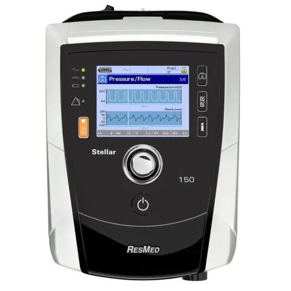 The ResMed Stellar 150 Noninvasive Ventilator is an advanced portable ventilation device designed for long-term non-invasive respiratory support. Equipped with multiple ventilation modes including iVAPS, internal battery backup, and monitoring features, it provides dependable support for clinical and home care settings.